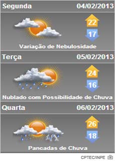 Terça com Sol e aumento de nuvens e pancadas de chuva com trovoadas a partir da tarde devido ao calor no Oeste, Meio Oeste e Planalto. Nas demais regiões, Sol com aumento de nuvens. Temperatura amena pela manhã e em gradativa elevação no decorrer do dia.