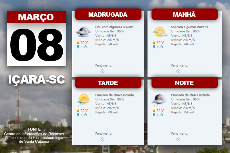 A presença de nuvens aumenta no decorrer do dia desta terça-feira. Entre a tarde e noite pode surgir ainda pancadas localizadas e passageiras de chuva, típicas de verão. O Centro de Informações de Recursos Ambientais e de Hidrometeorologia de Santa Catarina indica ainda temperatura elevada e vento fraco de sudeste a nordeste.