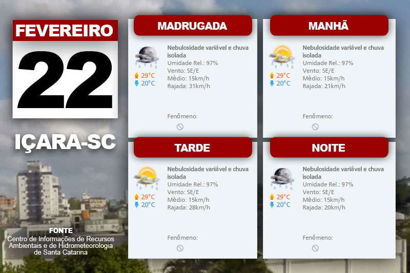O Sol aparece com aumento de nuvens no decorrer desta segunda-feira. A partir da tarde, pancadas isoladas de chuva com trovoada ocorrem principalmente no Oeste, Meio-Oeste e Planaltos Norte e Sul. O Centro de Informações de Recursos Ambientais e de Hidrometeorologia de Santa Catarina indica ainda temperatura mais amena no litoral e elevada no Oeste.
