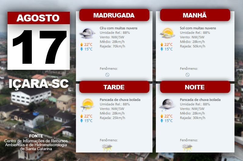 As nuvens com chuva se estendem a partir do Oeste e Meio-Oeste para as demais regiões no decorrer do dia. Há risco de temporal isolado com granizo. O Centro de Informações de Recursos Ambientais e de Hidrometeorologia de Santa Catarina indica ainda temperatura máxima em declínio, além de vento noroeste a sul, fraco a moderado, com rajadas.