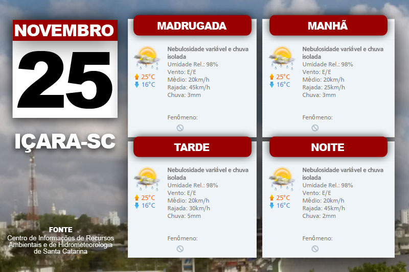 As nuvens continuam predominando, mas com chance de maiores aberturas de Sol do Oeste ao Planalto. No Litoral, Vale do Itajaí e Planalto Norte a condições de chuva ocorre de forma fraca e passageira. O Centro de Informações de Recursos Ambientais e de Hidrometeorologia de Santa Catarina aponta ainda temperatura em pequena elevação.