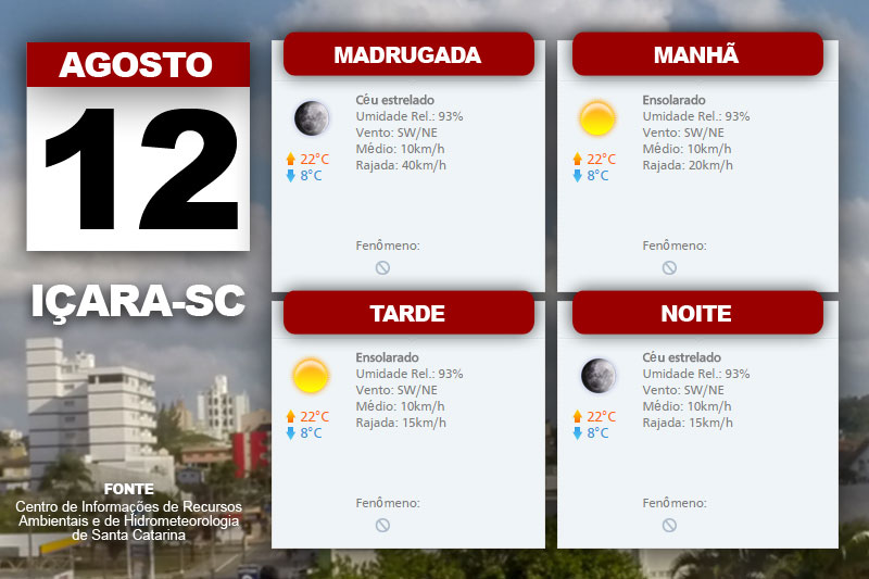 O tempo permanece estável com sol em todas as regiões nesta sexta-feira. O Centro de Informações de Recursos Ambientais e de Hidrometeorologia de Santa Catarina indica ainda temperatura baixa na madrugada e início do dia, além de vento Nordeste, fraco a moderado.