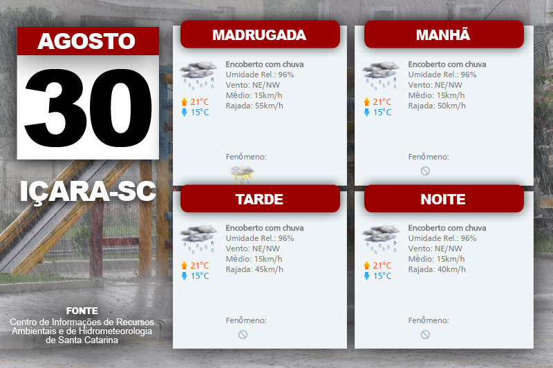 A condição de céu encoberto com chuva e trovoada ocorre em todas as regiões do estado nesta terça-feira. Está mantido ainda o risco de temporal isolado com rajadas fortes de vento e granizo. Além disso, o Centro de Informações de Recursos Ambientais e de Hidrometeorologia de Santa Catarina indica um pouco mais de declínio na temperatura.