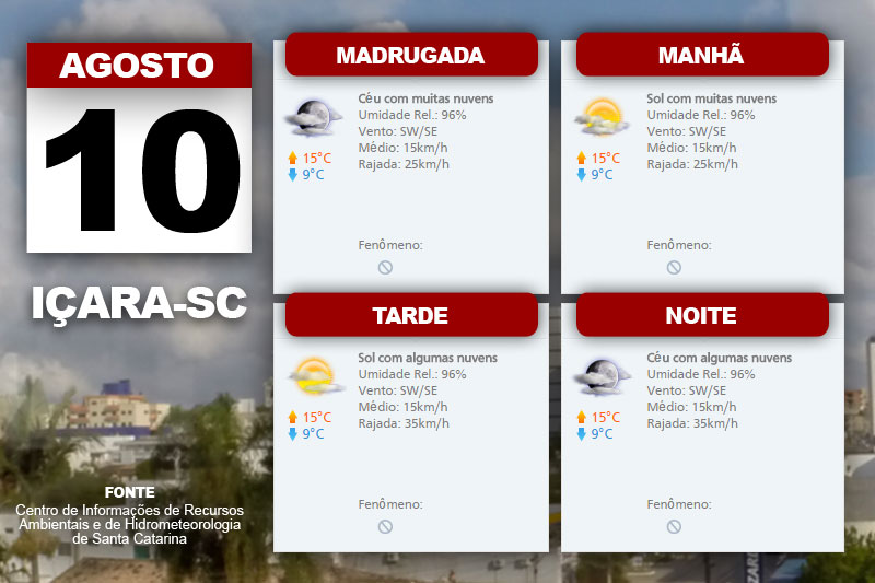 As nuvens chegam com condições de chuva fraca no Litoral, Vale do Itajaí e Planalto Norte. Mas no decorrer do dia o sol aparece em boa parte do estado. O Centro de Informações de Recursos Ambientais e de Hidrometeorologia de Santa Catarina indica ainda temperatura mais baixa, vento sudoeste a sudeste, fraco a moderado, com rajadas no Litoral.
