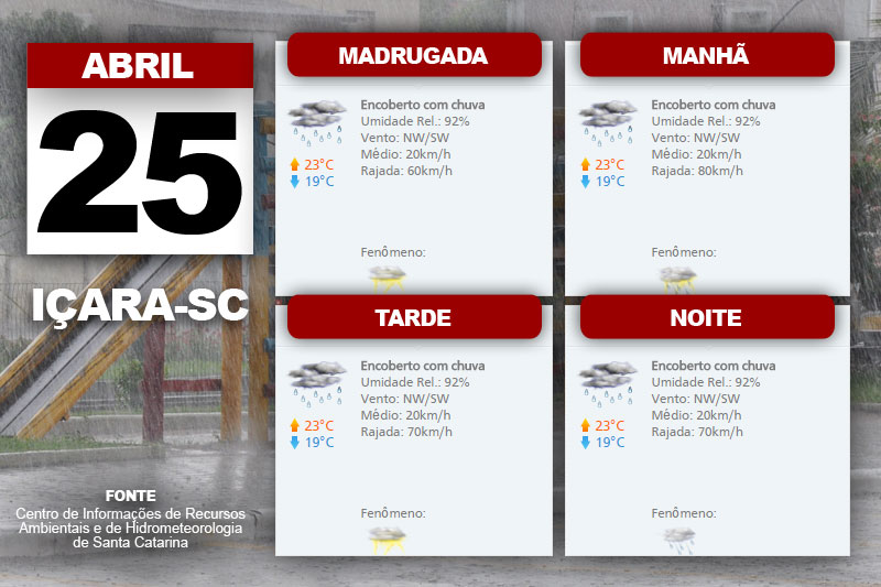 A segunda-feira será chuvosa no estado. A previsão é de até 80 mm, além do risco de rajadas intensas de vento e granizo isolado. Os totais mais elevados e as maiores chances de temporal são esperados para o Oeste, Meio-Oeste, Planalto Sul e Litoral Sul. O Centro de Informações de Recursos Ambientais e de Hidrometeorologia de Santa Catarina indica ainda temperatura em declínio acentuado do Oeste ao Sul.