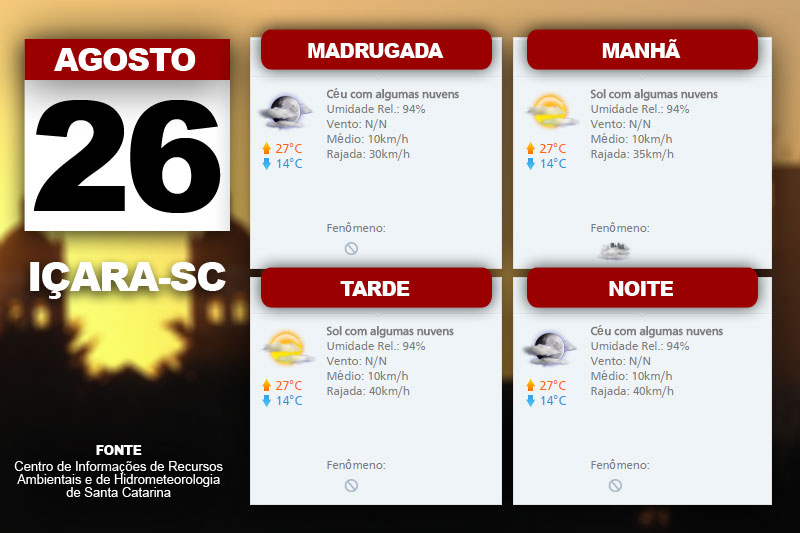 O Sol predomina em todas as regiões catarinenses na tarde desta sexta-feira. Isto significa que a temperatura amena pela manhã se tornará mais elevada após meio-dia. O Centro de Informações de Recursos Ambientais e de Hidrometeorologia de Santa Catarina indica ainda vento fraco a moderado de nordeste e norte.