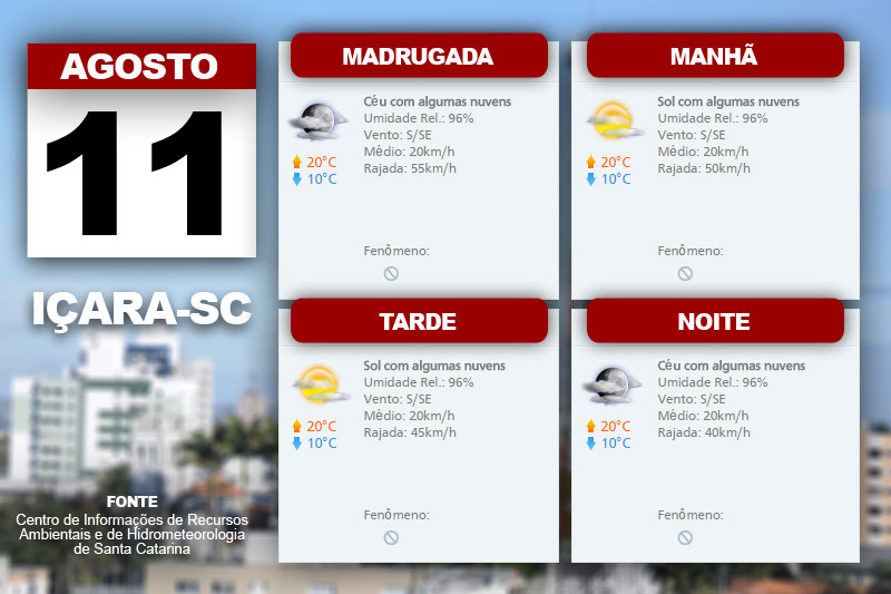 O Sol predomina em todo o estado após nevoeiros no início do dia. O Centro de Informações de Recursos Ambientais e de Hidrometeorologia de Santa Catarina indica ainda remperatura baixa na madrugada e início do dia, com geada fraca nas áreas altas do Oeste ao Planalto, além de vento sul a sudeste, fraco a moderado, com rajadas no Litoral.