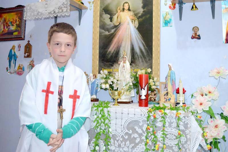 Aos oito anos o estudante Jean de Oliveira Gabriel trocou a bola e carrinhos por imagens sacras. A decisão de ser padre é incentivada pelos pais, principalmente a mãe, Sueli. Segundo ela, desde muito pequeno o filho já gostava de colecionar santos. “Comprei um crucifixo quando ele tinha dois anos de idade. Agora que ele cresceu fiz uma batina para ele”, relata.