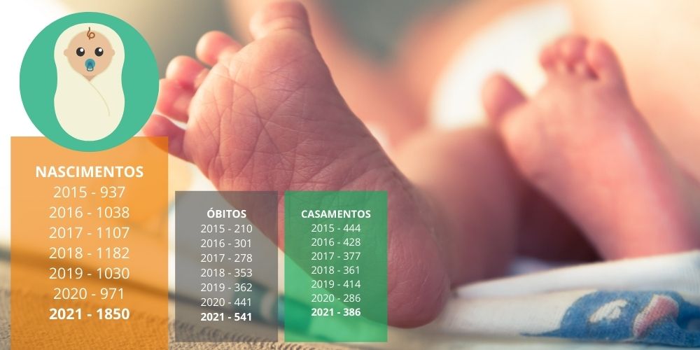 CASAMENTOS - Os matrimônios também tiveram crescimento em 2021, mas não chegaram ainda ao número pré-pandemia. Em 2019, Içara teve 414 casamentos civis, em 2020 chegou a 286 e em 2021, alcançou 386 uniões civis.