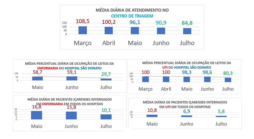 Em relação ao hospital São Donato, a média diária de atendimento de pacientes com covid-19 começou a virar a curva para baixo em junho. Na unidade de terapia intensiva da instituição, a média diária de ocupação de leitos caiu 19,7% entre abril e julho. Já na enfermaria da instituição hospitalar de Içara, a queda entre maio e julho alcançou 49,4% na média de atendimentos diários.