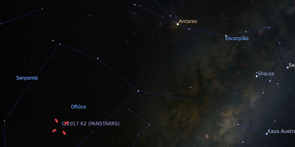 Segundo o físico, que é doutorando em astronomia, os observadores que estiverem no hemisfério sul serão privilegiados para observar o cometa em quase toda a noite do dia 14. Para tanto, basta olhar para a constelação de Ophiuchus, tendo como referência a constelação de Escorpião, como mostra a imagem abaixo.