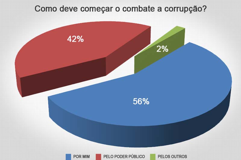 Como deve começar o combate a corrupção? Para 56% dos internautas do Canal Içara, esta transformação depende deles mesmos. Outros 42% indicam que é preciso primeiro moralizar o Poder Público e apenas para 2% o combate precisa iniciar pelas outras pessoas. Ao todo foram contabilizados 48 votos entre os dias 31 de agosto e 7 de setembro.