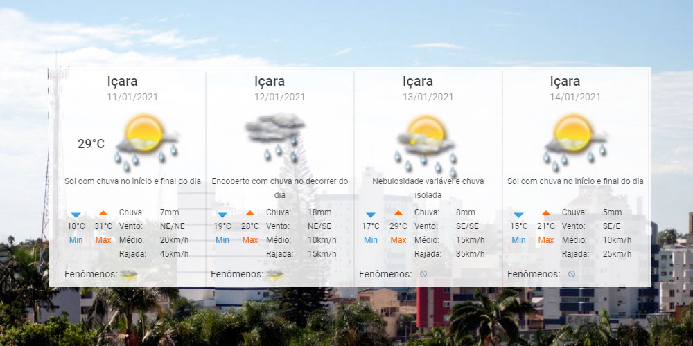 O calor permanece em Santa Catarina. Mas as temperaturas elevadas serão acompanhadas também pela possibilidade de temporais, principalmente na terça-feira, dia 12. Para Içara, o Centro de Informações de Recursos Ambientais e de Hidrometeorologia de Santa Catarina aponta mínimas de 15°C a 18°C e máximas de 21°C a 31°C ao longo da semana.