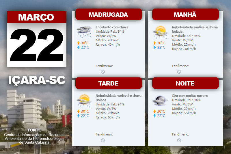 A condição de chuva diminui ao longo desta terça-feira com aberturas de sol em boa parte do estado. O Centro de Informações de Recursos Ambientais e de Hidrometeorologia de Santa Catarina indica ainda temperatura em elevação, diminuindo no fim do dia. Já o vento ocorre de Oeste a sudoeste, moderado, com rajadas mais intensas no litoral.