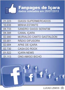 Se valesse premiação, o vice-prefeito e presidente municipal do PMDB Sandro Giassi Serafim teria a medalha de bronze com 4,7 mil curtidores em www.facebook.com/sandrogiassi. Na sequência há o Canal Içara com 4,3 mil (/portalcanalicara), o prefeito Murialdo Canto Gastaldon com 3,9 mil (/murialdo.cantogastaldon), Rádio Difusora com 3,9 mil (/difusora910), Apae de Içara com 2,9 mil (/apaeicara.sonhodourado), Casa do Rock com 2,7 mil (/acasadorock), Içara News com 1,5 mil (/portalicaranews) e ONG Amigo Bicho com 1,1 mil (/OngAmigoBicho).