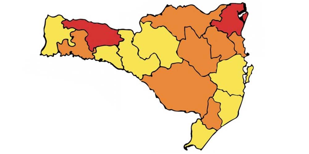 A Região Carbonífera teve reclassificação no mapa de risco potencial para a covid-19 neste sábado, dia 21. Até então considerada em nível alto (amarelo), as cidades que fazem parte da Amrec agora aparecem em situação grave (laranja), assim como outras seis regiões. Apenas o Nordeste e Xanxerê, por vez, estão neste momento em risco gravíssimo (vermelho).