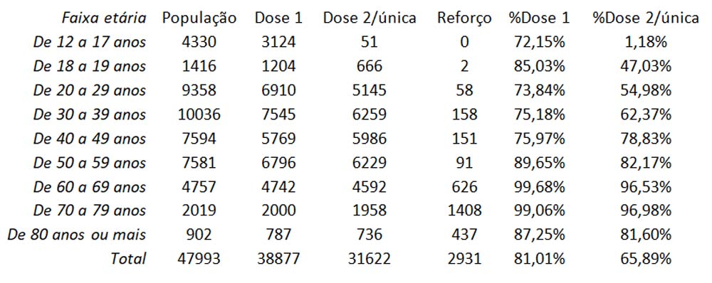 Ao todo, 38.878 içarenses receberam a primeira dose, havendo ainda a aplicação de 2.931 doses de reforço a idosos e profissionais de saúde e 23 doses adicionais, ministradas a imunossuprimidos.