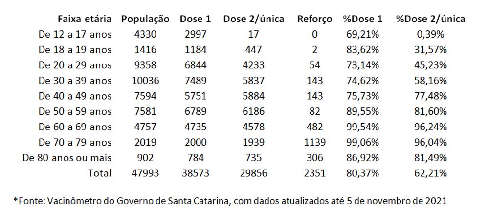 Ao todo, o município administrou 38.574 doses em primeira aplicação. Foram ainda 2.351 doses de reforço a idosos e profissionais de saúde que concluíram o esquema vacinal há seis meses e 23 doses adicionais a imunossuprimidos.