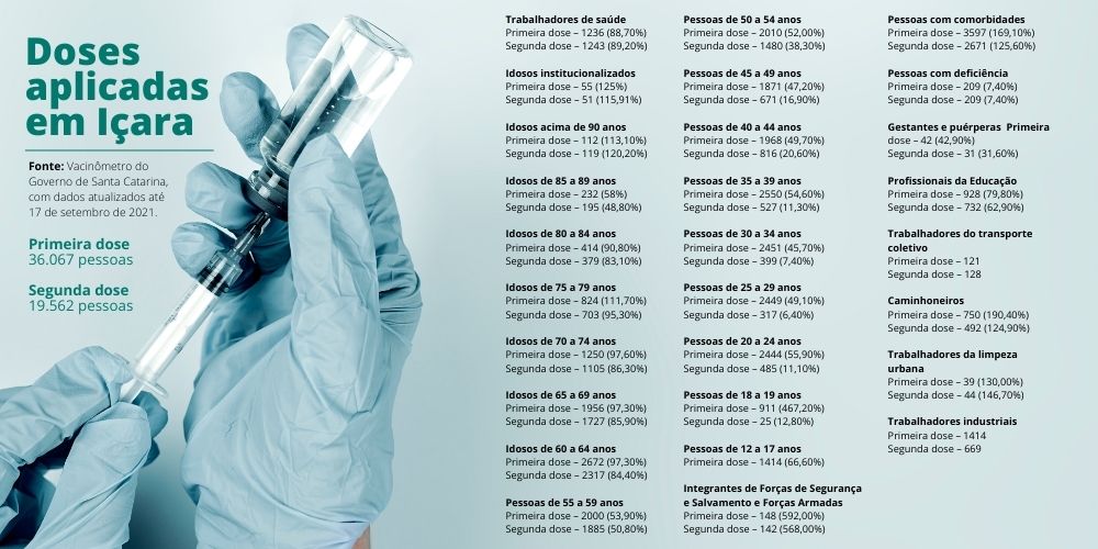 Atualizados até esta sexta-feira, dia 17, os dados do Vacinômetro do Governo do Estado mostram que Içara contabiliza 55.629 aplicações de vacinas contra o coronavírus. No município, 36.067 pessoas tomaram a primeira dose do imunizante, sendo que 19.562 já receberam também a segunda dose. O grupo que apresenta o maior número de vacinados é o das pessoas com comorbidades, com 3.597 aplicações de primeira dose e 2.671 de segunda dose.