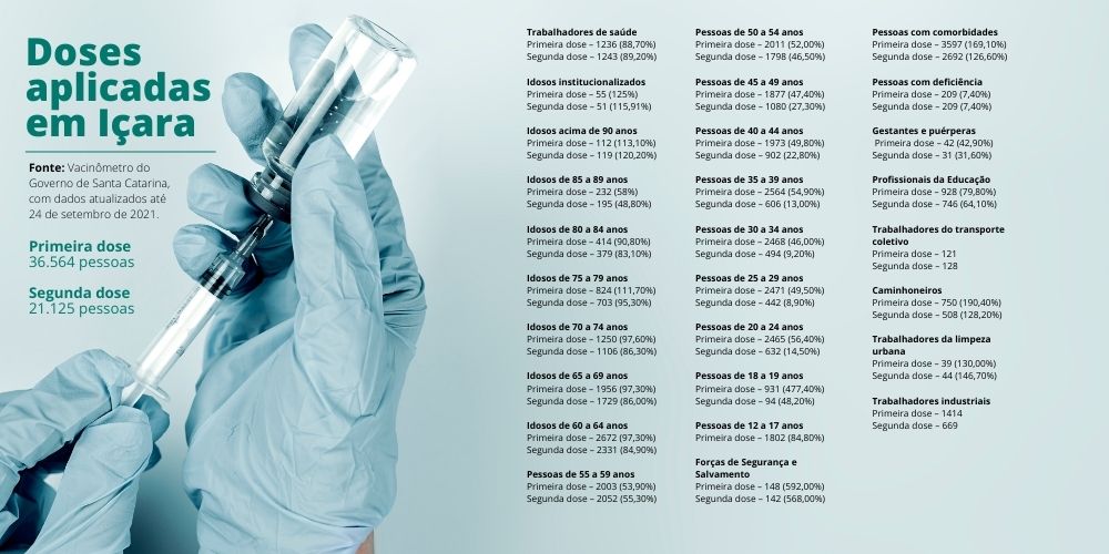 Até o momento, 36.564 pessoas receberam a primeira dose da vacina em Içara, das quais, 21.125 já tomaram também a segunda dose