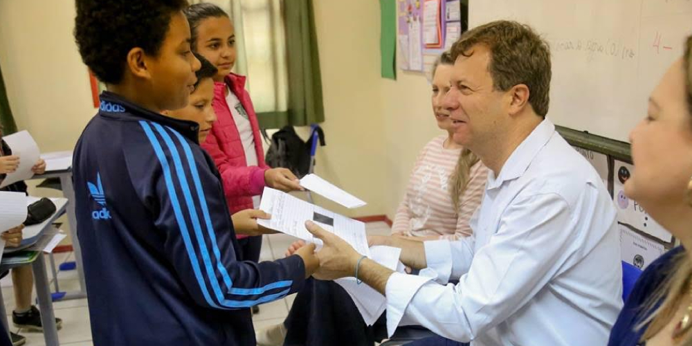 Os alunos do 4º ano da Escola Estadual Quintino Folhiarini Dajori, do bairro Presidente Vargas, receberam o prefeito Murialdo Canto Gastaldon (MDB) e a primeira-dama - presidente do Departamento de Fomento a Atividades Inclusivas (FAI) - Ceneli Freitas Gastaldon, nesta sexta-feira, dia 26. A visita fez parte do projeto interdisciplinar sobre trânsito, administração pública, segurança, vida em comunidade, escola e respeito às diferenças. Além do diálogo, as crianças aproveitaram o momento para entregar as demandas verificadas no bairro ao prefeito.
