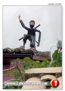 Nos dois casos, a montagem do esqueleto foi realizada com cano de PVC. Já os detalhes como as mãos e os olhos do ninja foram confeccionados com massa plástica. E, para que tudo ficasse bem firme sobre os telhados, a estrutura foi soldada com arames. Questionado sobre um nome para o ninja, Shiro afirma não ter pensado no assunto. "Uma vizinha nossa já o chama de Lig Lig Lé, por causa de um personagem existente numa novela da TV Globo", explica ele.