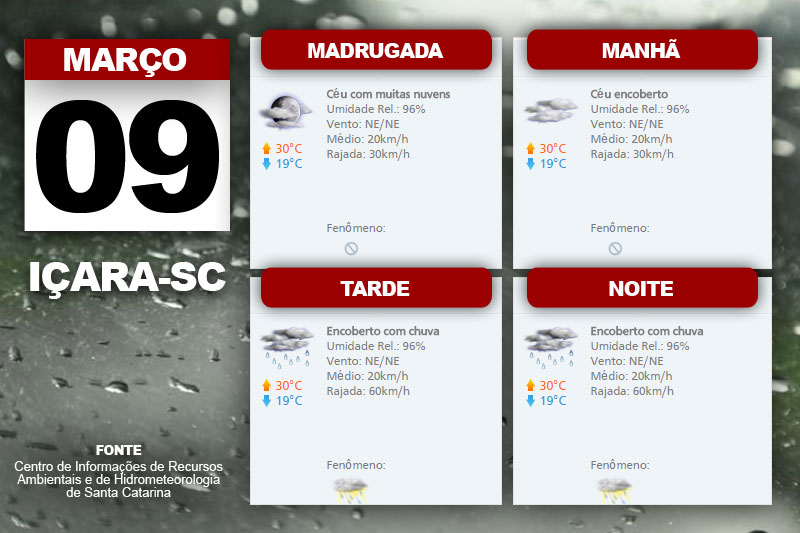 A chuva começa moderada a forte no Oeste e atinge as demais regiões a partir da tarde em Santa Catarina. Há risco inclusive de temporal isolado e acumulados significativos de chuva. Em consequência da previsão de até 50mm a Defesa Civil já emitiu alerta. O Centro de Informações de Recursos Ambientais e de Hidrometeorologia de Santa Catarina indica ainda temperatura elevada com sensação de ar abafado na maioria das regiões, além de vento nordeste, fraco a moderado, com rajadas.