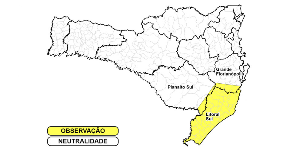 As condições são de tempo severo no Litoral Sul de Santa Catarina a partir da tarde desta quarta-feira, dia 16. O alerta da Defesa Civil indica risco de temporais com queda de granizo e rajadas de vento entre meio-dia e 22h. "Não se descartam alagamentos, enxurradas e deslizamentos pontuais", indica o órgão estadual.
