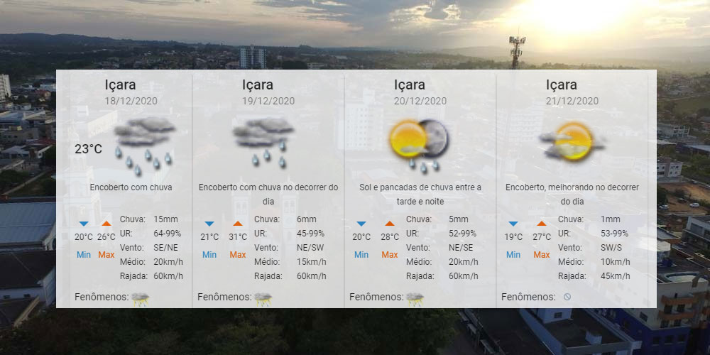 O aviso metereológico emitido pela Defesa Civil do Estado se estende pelo menos até a manhã de sábado. Para Içara, o Centro de Informações de Recursos Ambientais e de Hidrometeorologia de Santa Catarina indica ainda mínimas de 19°C e máximas próximas de 31°C ao longo dos próximos dias. Confira o detalhamento: