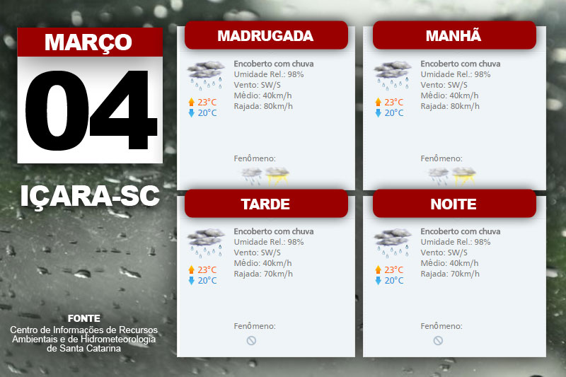 O tempo encoberto com chuva permanece nesta sexta-feira. O alerta da Defesa Civil é principalmente para o Litoral Sul, onde o volume acumulado pode variar de 50 a 70mm. O Centro de Informações de Recursos Ambientais e de Hidrometeorologia de Santa Catarina indica ainda temperatura em elevação do Oeste ao Planalto, mais amena no Litoral.