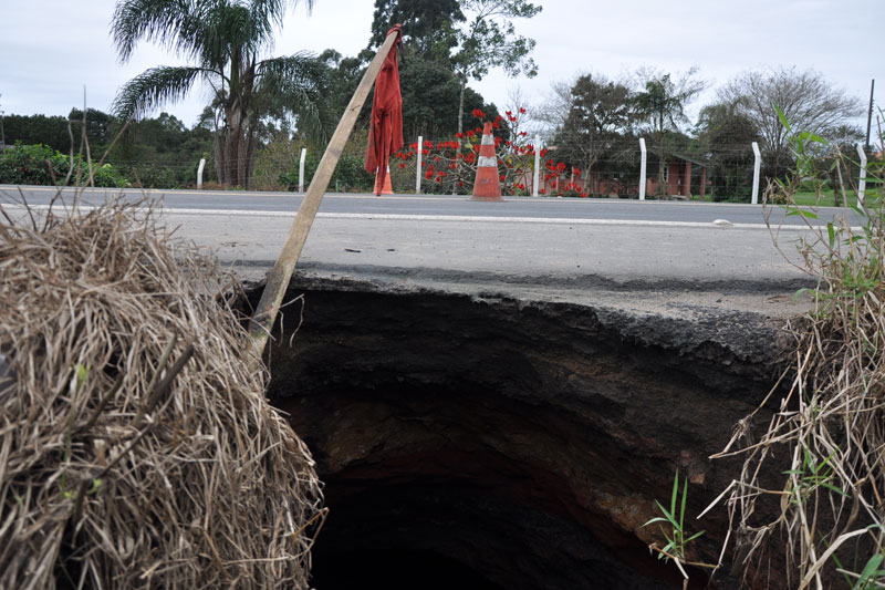 O desvio improvisado pelo acostamento da Rodovia Deputado Paulino Búrigo (SC-445) em Sanga Funda será mantido por no mínimo uma semana. Esta é a previsão do Departamento de Infraestrutura de Santa Catarina devido a erosão abaixo do pavimento [Risco de desmoronamento atinge SC-445]. "Vamos aterrar o sistema antigo de drenagem que estava entupido e desviaremos o fluxo da água para os dutos mais novos. Para isso manteremos uma pista fechada. Esperamos não precisar mexer no asfalto. Mas se for necessário, também faremos isto. A obra iniciará já nesta terça-feira", coloca o superintendente regional, Lourival Pizzollo.