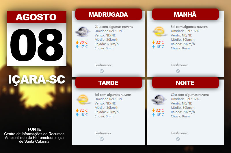 O sábado não será diferente dos dias anteriores. Isto significa que o Sol vai predominar em todas as regiões catarinenses. A previsão é de temperatura na casa dos 30ºC no Oeste e no Litoral Sul. “Vento de nordeste, fraco a moderado, com rajadas mais fortes do Oeste ao Litoral Sul”, aponta a meteorologista do Centro de Informações de Recursos Ambientais e de Hidrometeorologia de Santa Catarina, Gilsânia Cruz. As mesmas condições também serão repetidas no domingo, Dia dos Pais.