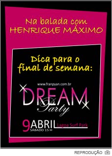 O Lagoa Surf Park, no Balneário Rincão, receberá neste próximo sábado, dia 10, a Dream Party. Organizada pela fotógrafa Fran Pyan em comemoração ao primeiro ano do site pessoal, a balada vespertina chegará com tudo. Entre as atrações, estarão Teto Fernandes, Patrick e Jovane, além dos DJs Ney Lopes, Seko e Leo Ghisi. A cerveja será R$ 2 e a comemoração terá ainda como atrativo o sorteio de um ensaio fotográfico. Ingressos a partir de R$ 20.