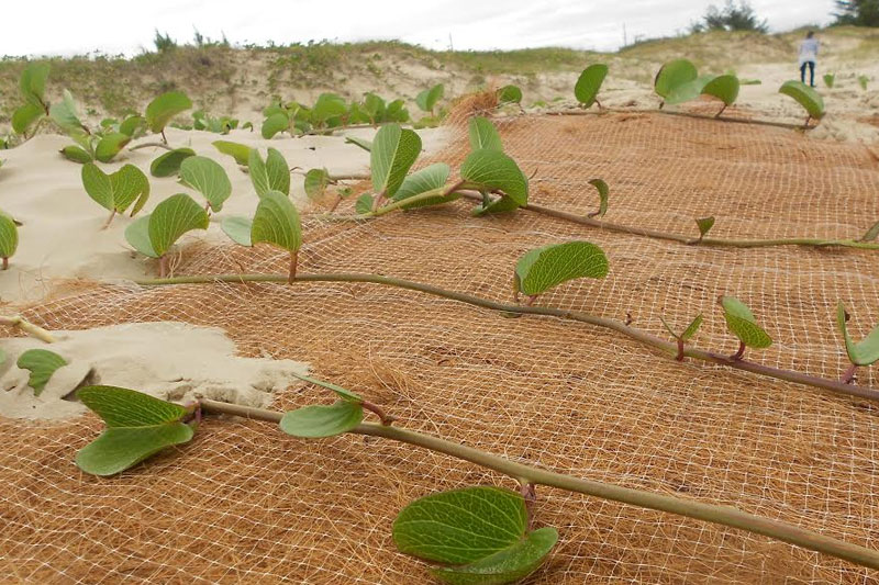 O acordo com firmado com o MPF prevê o Plano de Manejo de Contenção de Dunas. O projeto começou a ser planejado no ano passado. “A partir desse estudo, compramos uma manta, feita de palha de fibra de coco, que tem como objetivo conter o deslocamento da areia, enquanto a vegetação nativa se prolifera”, explica o diretor da secretaria, Roger Guimarães. Para impedir a movimentação da areia a equipe também fixou bambus.