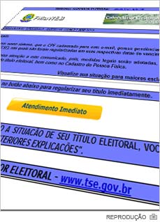 "O TSE reitera que não envia e-mails aos eleitores, nem mesmo para comunicar pendências ou cancelamento de títulos. A Corte Eleitoral também não autoriza qualquer instituição a fazê-lo. A única exceção são e-mails em resposta a dúvidas encaminhadas ao TSE", esclarece a Justiça Eleitoral. Para enganar os eleitores, a mensagem utiliza inclusive, de forma ilegal, o brasão da República, além do programa Filiaweb.