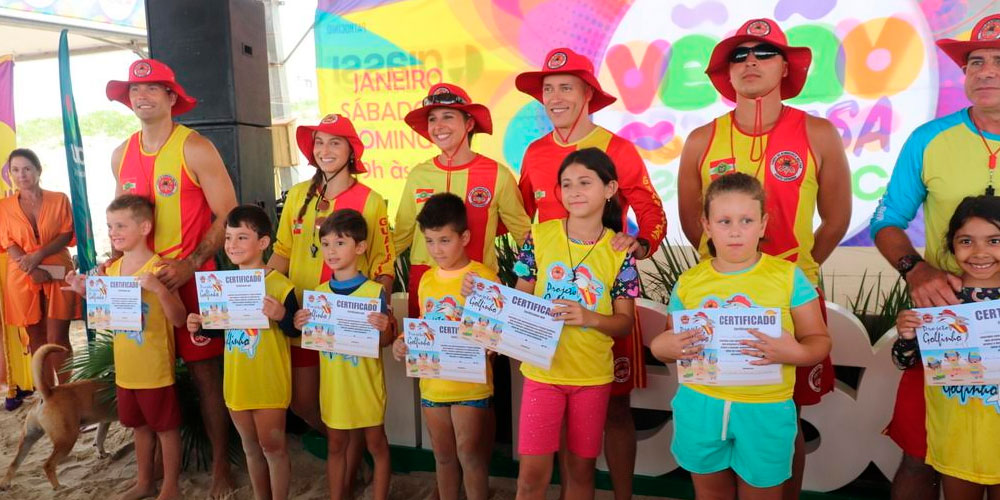 Divididas em quatro arenas, as crianças aproveitaram a manhã de aprendizado e, ao final das atividades, receberam certificado de conclusão e o tradicional banho de batismo dos novos Golfinhos. Em férias no Rincão com familiares, a carioca Adriana Silva Ferraz acompanhou uma neta e duas sobrinhas durante a ação. “Acho que eu aprendi mais do que elas, foi maravilhoso. Estou encantada”, elogiou.