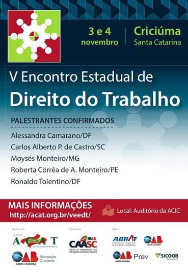 Reforma trabalhista, recurso de revista, terceirização, jovem advogado trabalhista, o novo Código de Processo Civil e o Processo do Trabalho serão temas debatidos durante o V Encontro Estadual de Direito do Trabalho na Associação Empresarial de Criciúma. O evento acontecerá pela primeira vez em Criciúma a partir desta quinta-feira, dia 3. As inscrições para as atividades até sexta-feira devem ser feitas no link http://acat.org.br/veedt/inscricoes/.