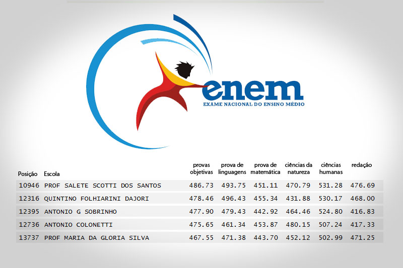 Das cinco escolas estaduais, apenas uma teve Indicador de nível socioeconômico alto. Foi o caso do Quintino Dajori. O restante foi enquadrado como médio alto. Já no indicador de permanência na escola, apenas o Salete Scotti foi enquadrado com 80% ou mais. O restante atingiu de 60 a 80%. Para a listagem, foram considerados alunos matriculados no terceiro anos do ensino médio que fizeram as quatro provas objetivas e a prova de redação, desde que não tenham tirado nota zero nas provas objetivas.