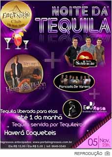 A noite será de música, badalação e muita bebida mexicana para as mulheres que forem ao Engenhos Club. Elas terão acesso liberado a doses de tequila das 23h de sábado até 1h de domingo, entre os dias 5 e 6. A balada em Vila Nova ocorrerá com a participação de Helipe & Helon, banda SobTração, Pancada de Vanera e o DJ Edu Rosa.