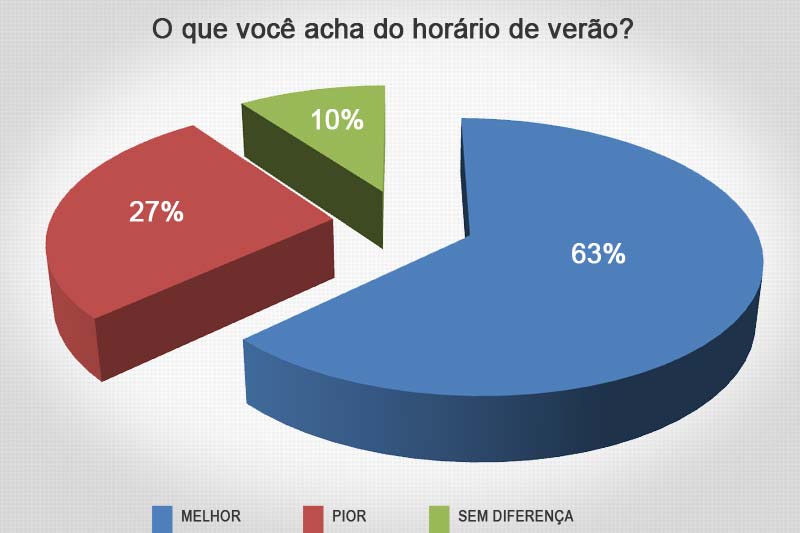 O que você acha do horário de verão? O questionamento foi respondido do dia 20 a 27 de outubro por 30 leitores na capa do portal Canal Içara. Dentre eles, 63% consideraram a interferência no relógio melhor. Outros 27% indicaram que a mudança é pior. Apenas 10% responderam com indiferença. O adiantamento nos relógios começou no dia 19 de outubro no Sul, Sudeste e Centro-Oeste. A edição 2014/2015 terá uma semana a mais para não coincidir com o Carnaval. Isto significa que vigorará até 23 de fevereiro.