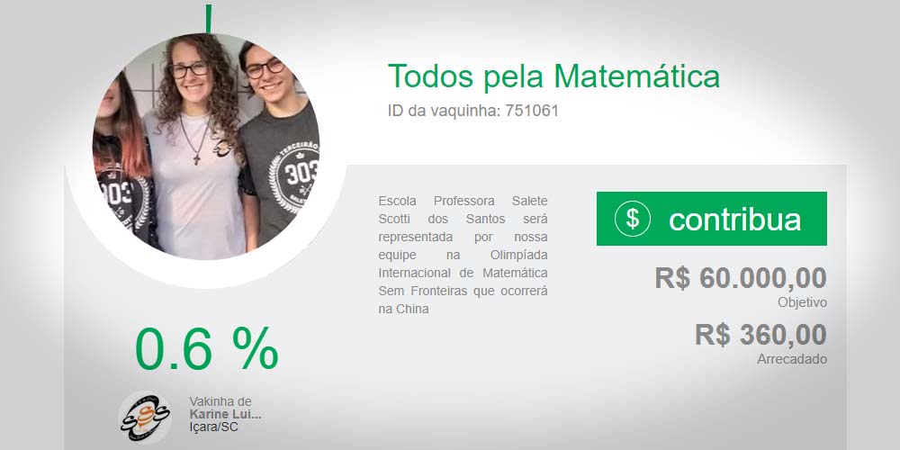 “É bem importante essa participação, pois contribui na formação destes alunos e professores, além de elevar a autoestima de toda a rede pública e valorizar o ensino da Matemática. Estamos em busca de ajuda com o Governo do Estado e empresas enquanto os estudantes criaram uma vaquinha para poderem ter condições de participar”, coloca a diretora Lilian Inácio da Silva Mendes. As doações podem ser feitas em www.vakinha.com.br.