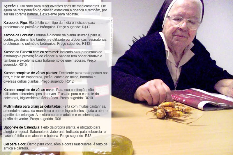 “Remédio natural não tem contraindicação. É como uma fruta, que a pessoa come e traz inúmeros benefícios. Mas, claro, cada planta tem seu poder curativo e é específica a algum problema. Eu faço os medicamentos todos os dias e os produtos são retirados da nossa horta, no Colégio Cristo Rei. Todos naturais, sem agrotóxicos e preparados da melhor forma possível”, explica irmã Inês.