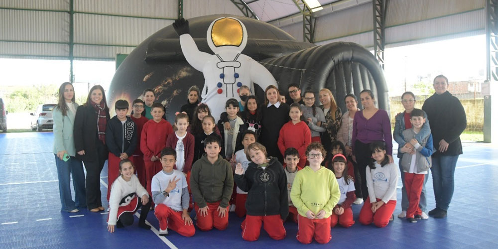 Para presentear os alunos no Dia do Estudante, a Escola Lúcia de Lucca, no bairro Jardim Silvana, ofereceu uma experiência diferente aos estudantes e os pais com Urânia Planetário Móvel nesta quinta-feira. A visita do primeiro planetário móvel digital do Brasil integra o projeto Conectados com o Mundo desenvolvido pela escola municipal. O equipamento foi instalado na quadra para a vivência de 224 alunos sobre o Planeta Terra, o restante do universo e ainda uma aventura surpresa com a simulação de uma montanha-russa.