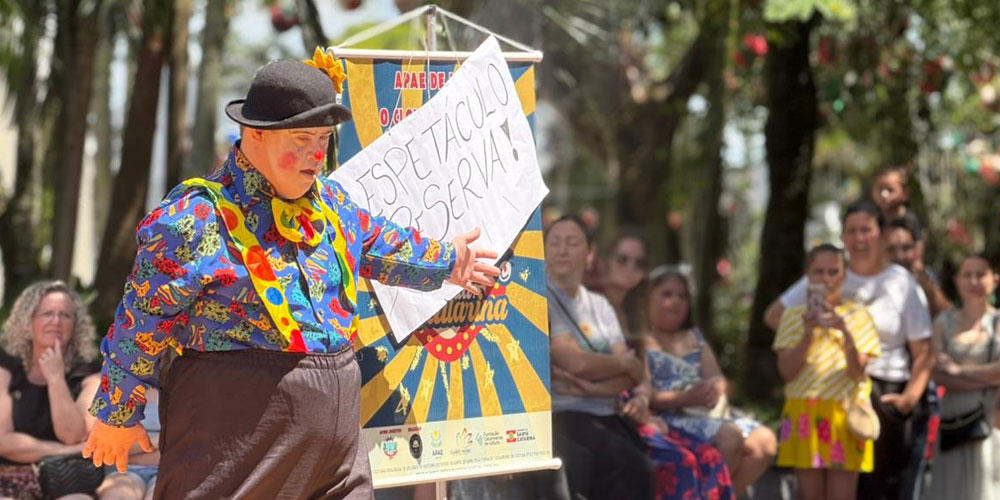 A união da arte com a força da inclusão despertou reflexões - e potentes risadas - na Praça da Matriz São Donato na manhã deste sábado, dia 6. Com plateia cheia, o Espetáculo da Bailarina estreou em clima de celebração após seis meses de preparação. A apresentação foi realizada pelo Grupo O Clown e o Down, vinculado à Apae de Içara, com fomento do Prêmio Elisabete Anderle de Estímulo à Cultura – Edição 2024, do Governo do Estado de Santa Catarina, por meio da Fundação Catarinense de Cultura, e apoio logístico do Governo Municipal.