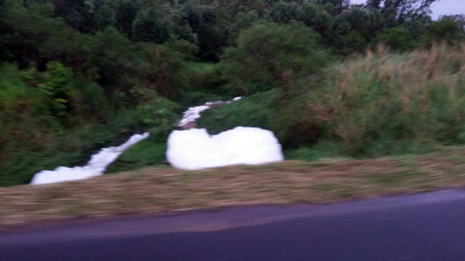 O temporal provocou a queda de um outdoor sobre o leito do Rio Três Ribeirões na tarde deste domingo, dia 17. Entretanto, o que mais chamou atenção foi o ressurgimento da espuma na margem da Rodovia Paulino Búrigo (SC-445). A camada branca sobre o afluente no bairro Nossa Senhora de Fátima se acumula num histórico de pelo menos três anos, sempre no mesmo ponto, na passagem pela galeria fluvial da rodovia estadual.
