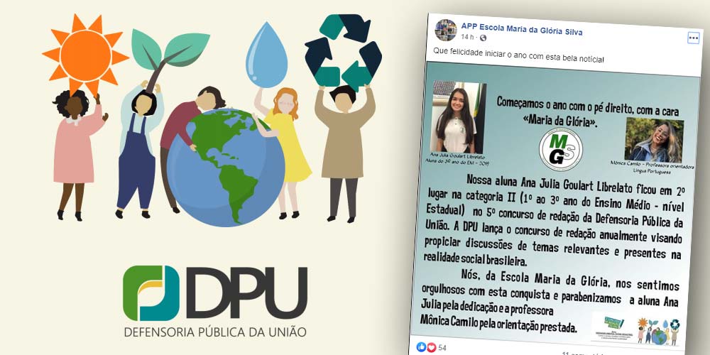Ana Júlia Goulart está entre as vencedoras do 5º Concurso de Redação da Defensoria Pública da União. A estudante da Escola de Educação Básica Maria da Glória Silva ficou em segundo lugar em Santa Catarina na categoria II (1º ao 3º ano do Ensino Médio) e será premiada com uma câmera digital pelos 97,27 pontos obtidos no desenvolvimento do tema Defender Direitos, Evitar Desastres: Como o Acesso à Justiça Contribui para o Desenvolvimento Sustentável.