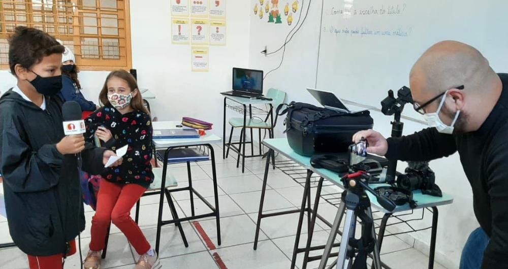 As turmas 41 e 42 da Escola Paulo Rizieri se transformou na redação do Canal Içara nesta sexta-feira, dia 2. Os estudantes conheceram a estrutura móvel utilizada para a produção e transmissão de conteúdo, além disso, participaram de uma atividade prática de entrevista em vídeo. Por um dia, Murilo Henrique da Silva Silveira foi repórter do portal. Já Maria Isabely Elias Teixeira foi escolhida para ser entrevistada sobre a atividade da turma do quarto ano do bairro Boa Vista sobre estudo do gênero textual de notícia.