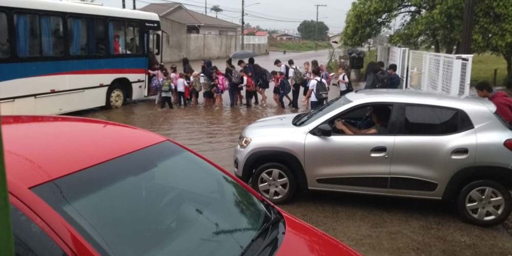 Choveu ao final da aula vespertina nesta sexta-feira, dia 22. E para os estudantes da Escola Antônio Colonetti que retornam para a casa a pé ou de ônibus não teve como fugir da rua alagada. Em dias assim, a fila para o transporte coletivo ocorre inclusive com os alunos de pés submersos devido ao alagamento na Rua Antônio Guglielmi.
