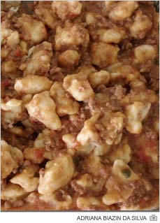São dois ovos, uma batatinha cozida pequena, meia colher de chá de sal, meio copo de água e farinha de trigo até dar o ponto. A mistura destes ingredientes dá um delicioso nhoque. Como molho pode ser o mesmo da carne moída, franco ou bacon.