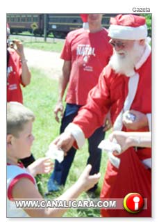 Fim de papo, agora é a hora de receber o anfitrião da festa, que chegou em cima de um dos vagões juntamente com seus 25 ajudantes ferroviários carregados de brinquedos e balas. A fila estabelecida pelos voluntários para que as crianças organizadamente recebessem os brinquedos e bala se desfez em segundos. Afinal de contas pra que fila, vale tudo para receber um abraço do Bom Velhinho. Faceiros, os irmãos José e João Vitor, carregavam seus presentes, cada um deles ganhou um carrinho do Papai Noel. A satisfação foi ainda maior por ter conseguido um forte abraço do “barbudo”. As crianças estavam radiantes com a festa natalina antecipada. Mas o interessante que os adultos também se emocionaram. Um exemplo foi o aposentado de 77 anos, João Ismael Rodrigues, que batia palmas e abriu um enorme sorriso devido à presença do velhinho. “Não quero presente, só um punhado de balas”, disse.